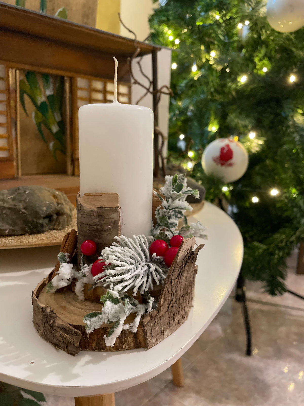 Candela natalizia decorata su tronco