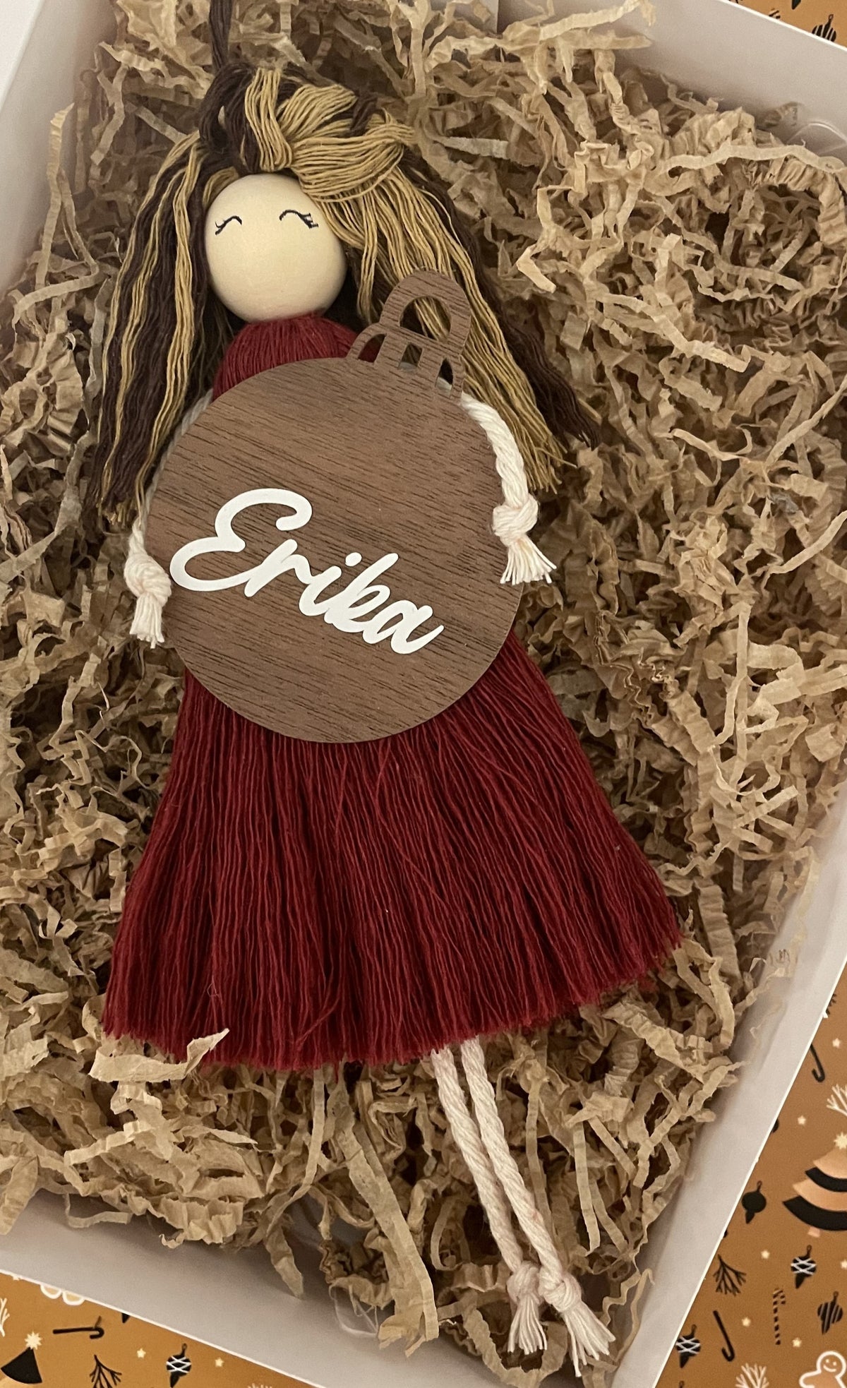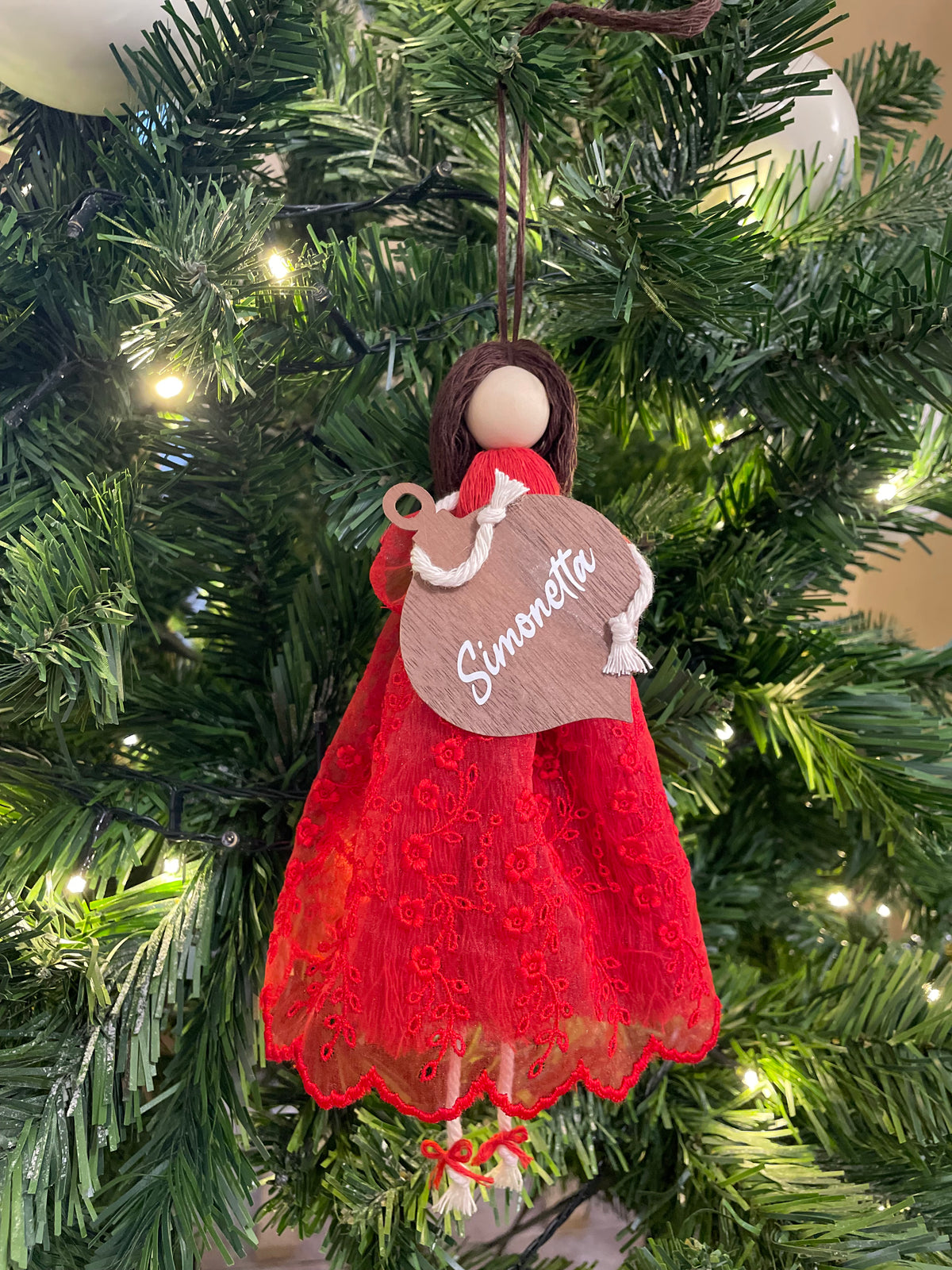 Bambolina in macramè con pallina in legno