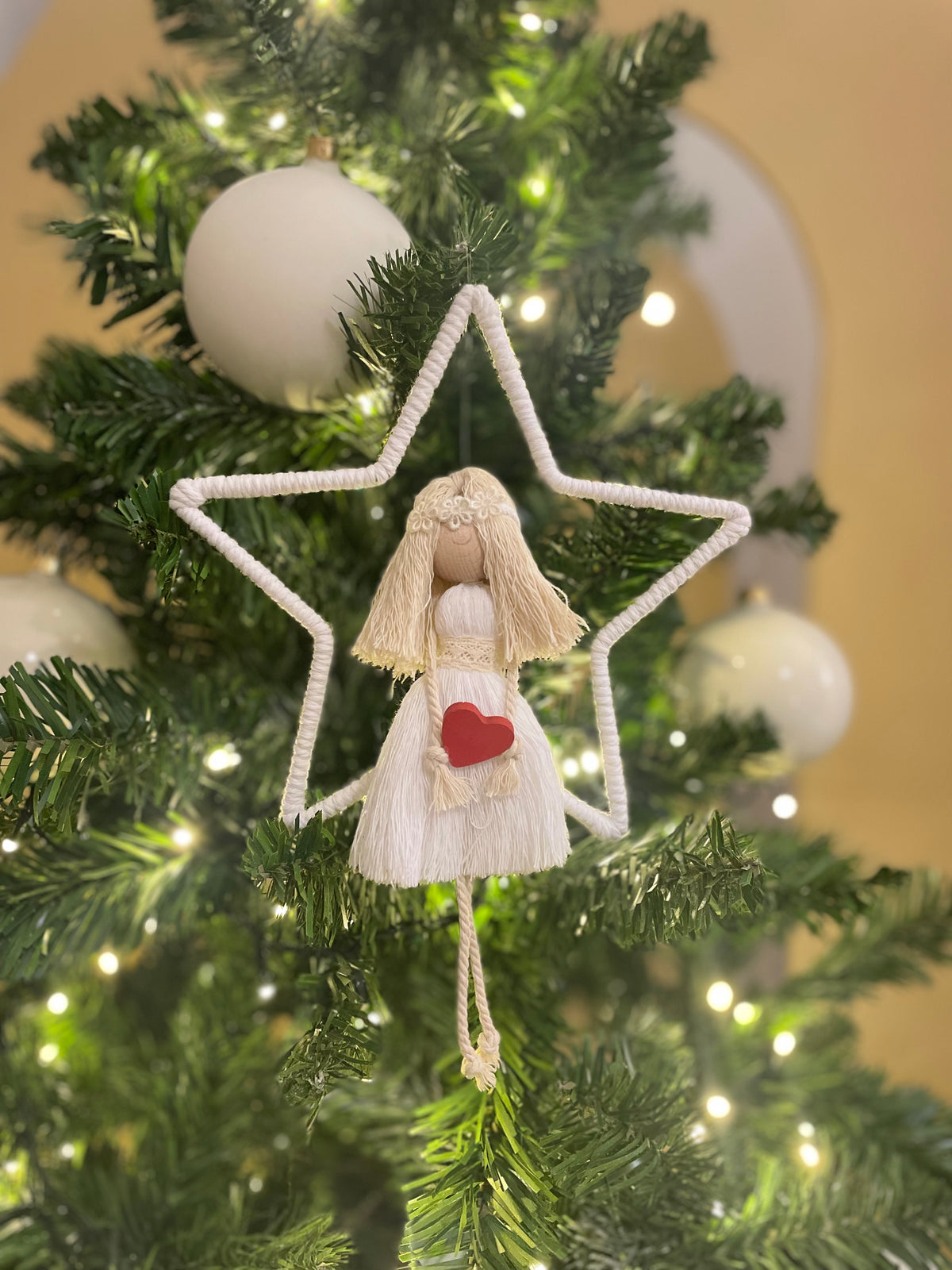 Aggiungi un tocco di eleganza al tuo albero di Natale con la Bambolina in macramè con stella. Disponibile in vari colori, questa bambolina è realizzata con filo, spago e legno di alta qualità. Aggiungi un tocco di tradizione artigianale al tuo albero con questo pezzo esclusivo e sofisticato.
