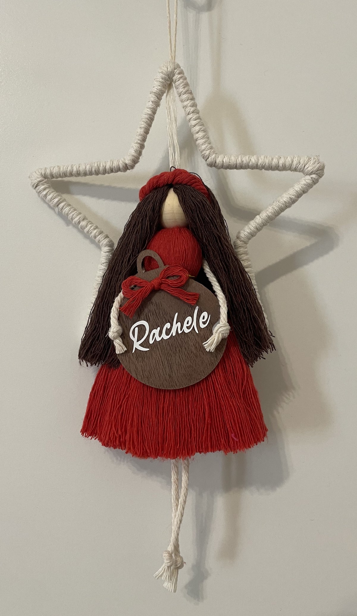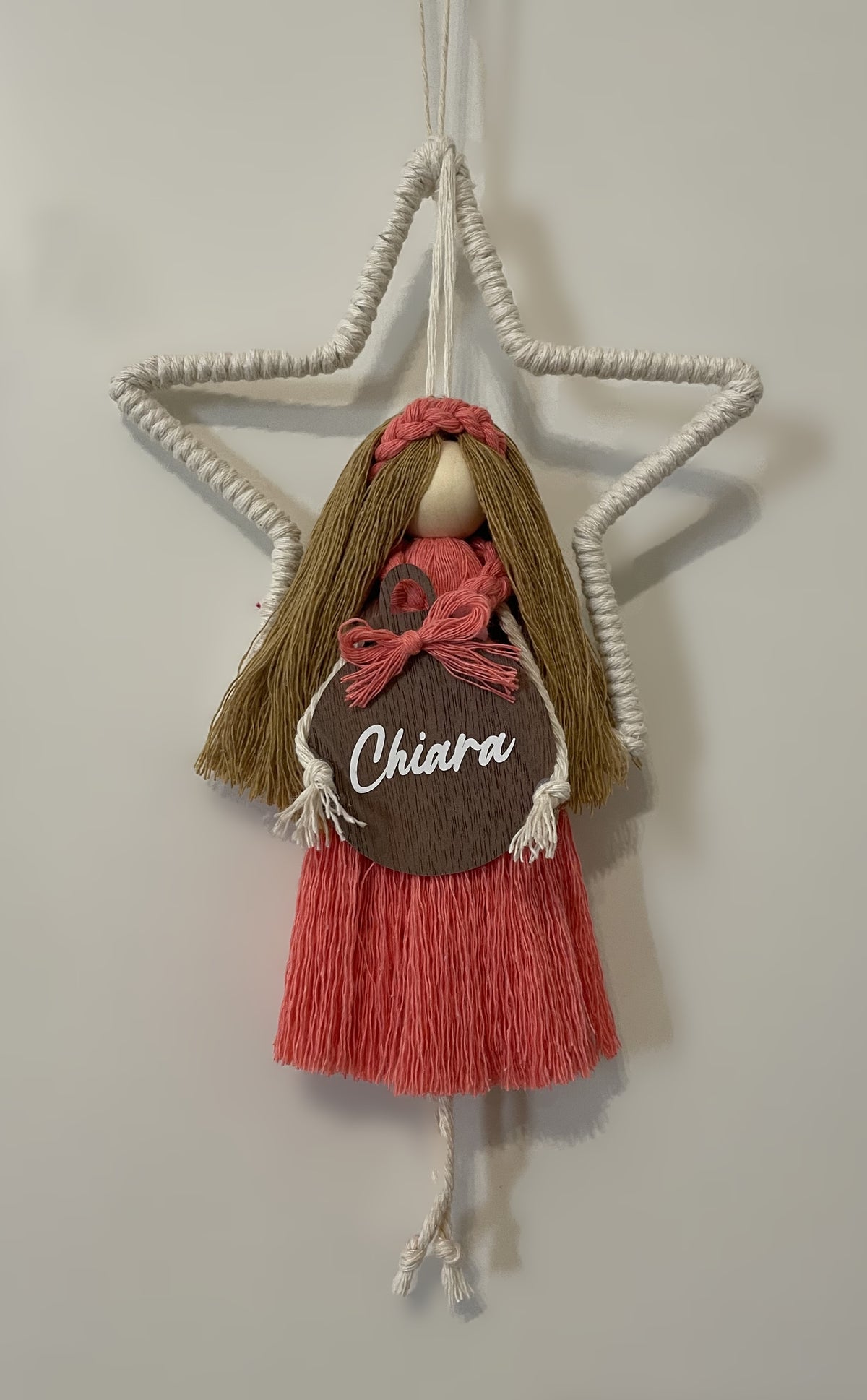 Bambolina in macramè con stella, vari colori, realizzato con filo, spago e legno.