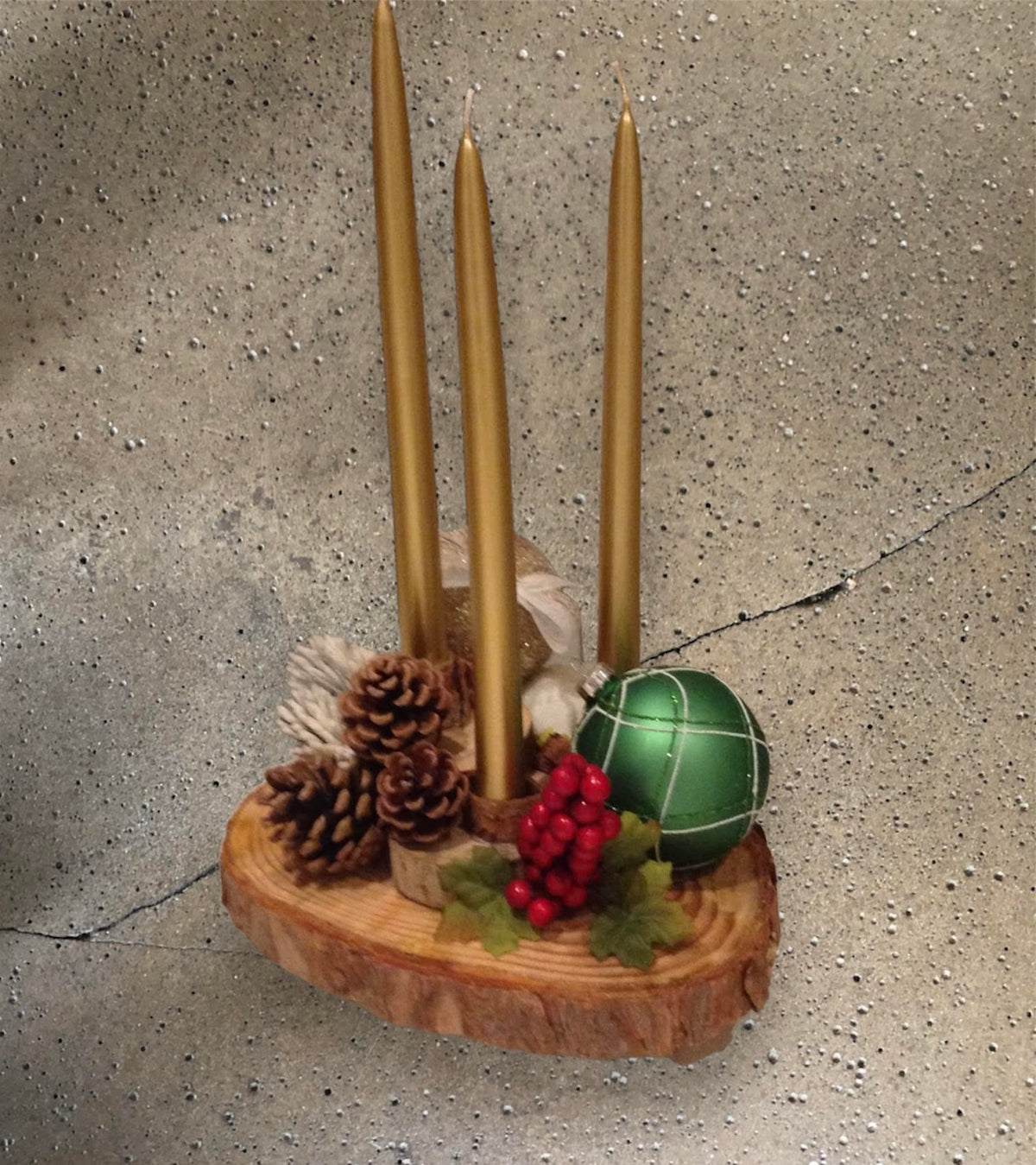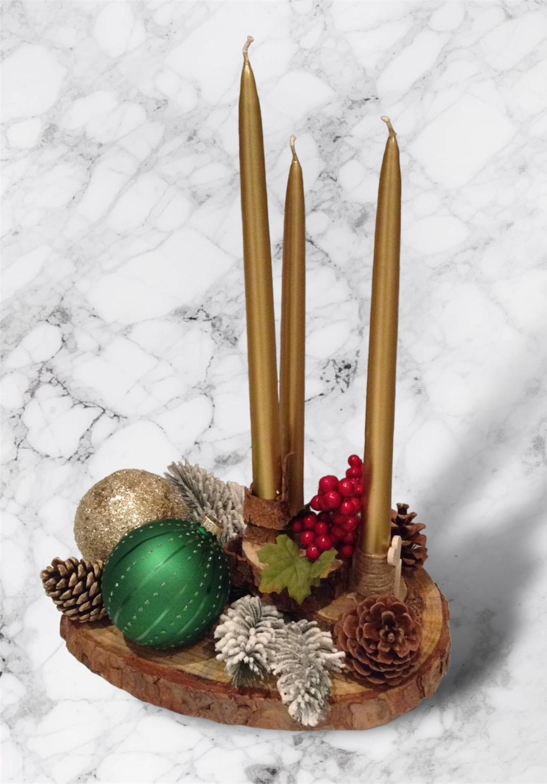 Centrotavola natalizio realizzato su ceppo, decorato con elementi naturali, sfere natalizie e candele a colonna. Dimensione 20 cm diametro.