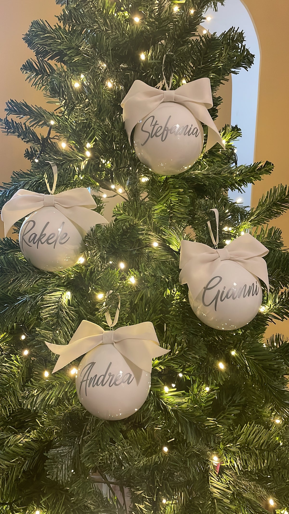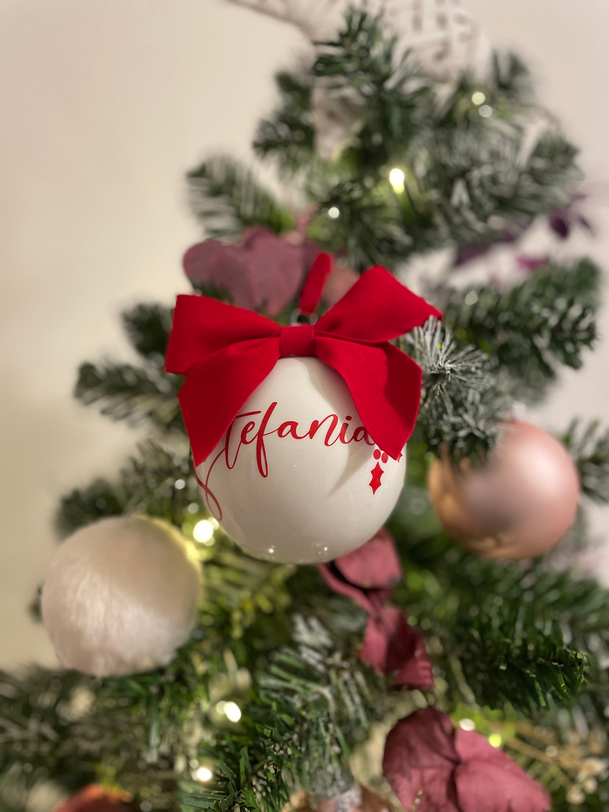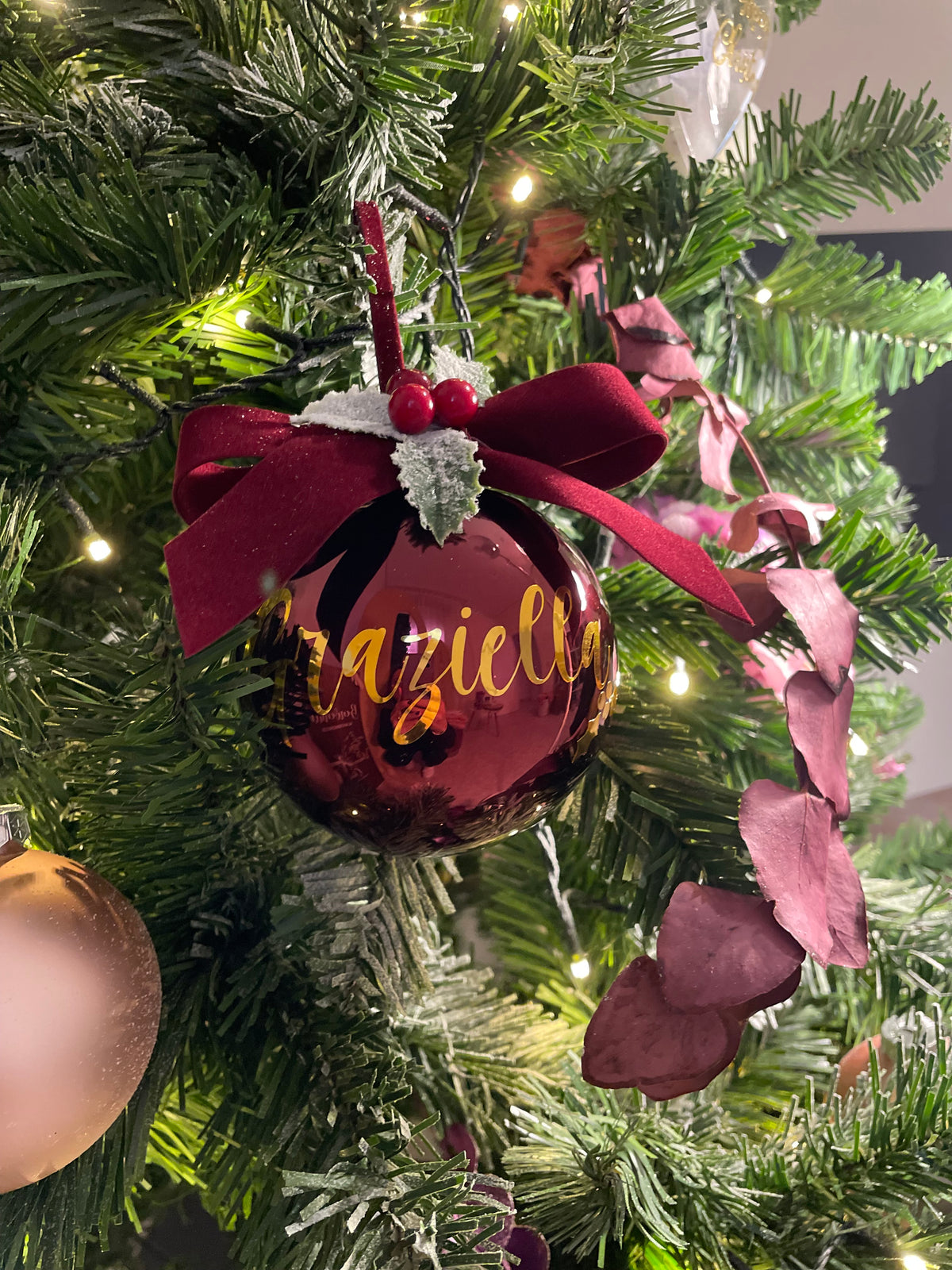 Porta l'eleganza natalizia nella tua casa con la nostra pallina in vetro colorata da 10 cm. Personalizzabile con il tuo nome grazie a una scritta delicata e un nastro raffinato. Crea un'atmosfera esclusiva e aggiungi un tocco di raffinatezza alla tua decorazione natalizia.