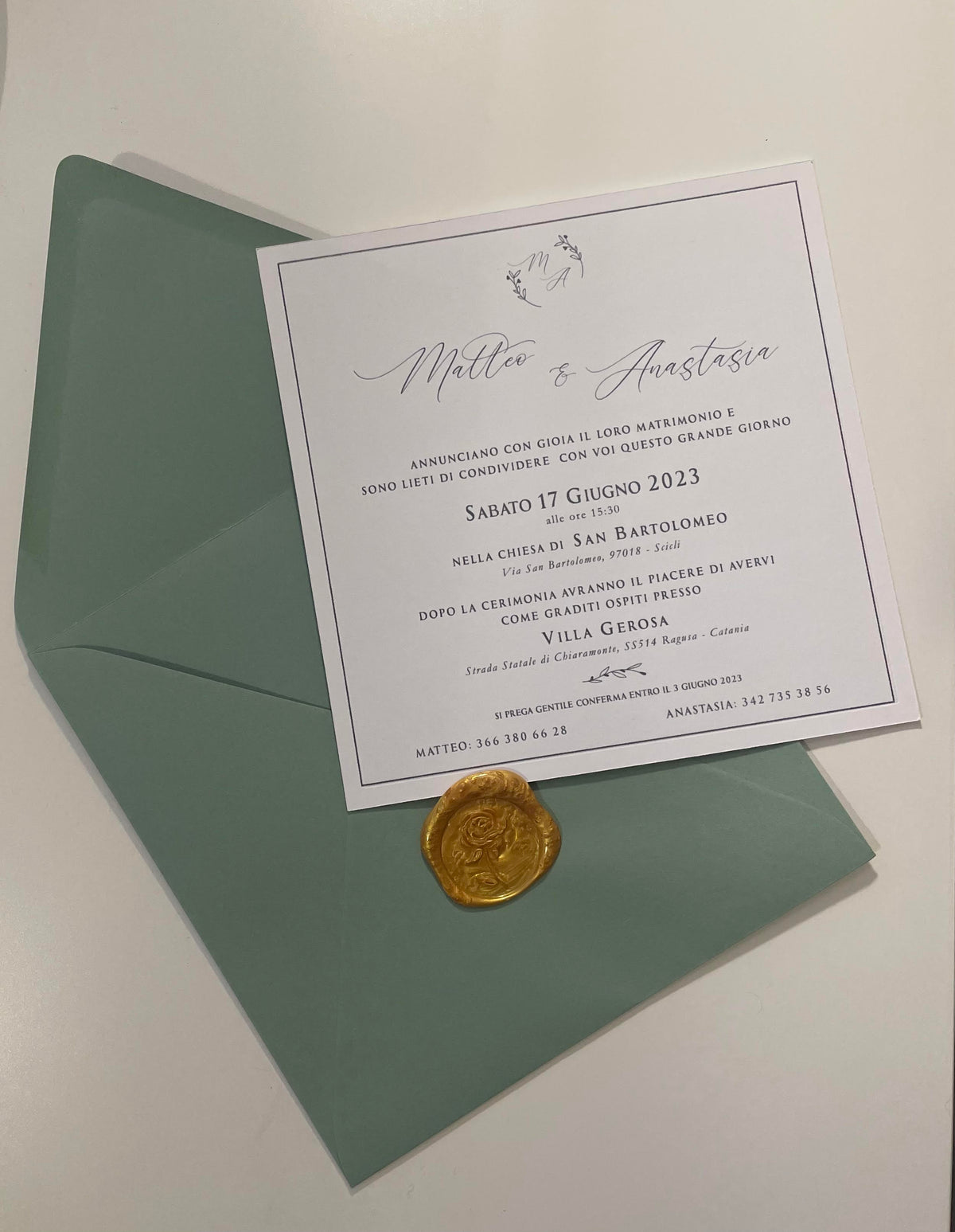 Partecipazione di nozze “Anastasia” formato cm 15x15 con sigillo in ceralacca. Personalizzabile nei colori e nella grafica