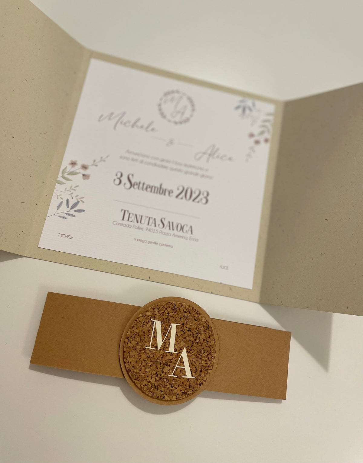 Partecipazione di nozze “Sughero” formato cm 15x15 pieghevole con cover in carta naturale e sigillo in sughero personalizzabile. Stampa su cartoncino martellato bianco