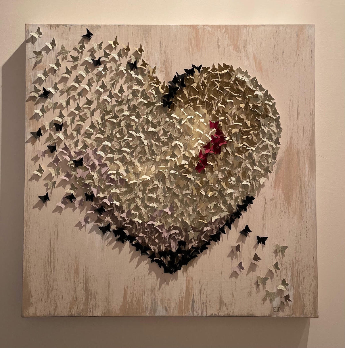Quadretto cuore farfalle in carta, realizzato a mano. Possibilità di scelta colore predominante. Dimensione 20x20cm.