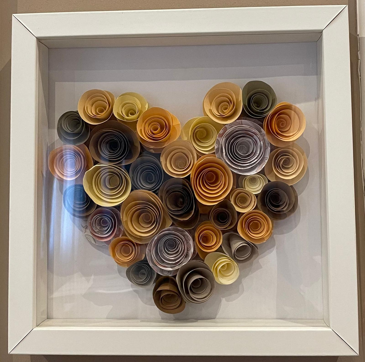 Quadro cuore 3D, con fiori in carta realizzati a mano. Dimensioni 25x25 cm