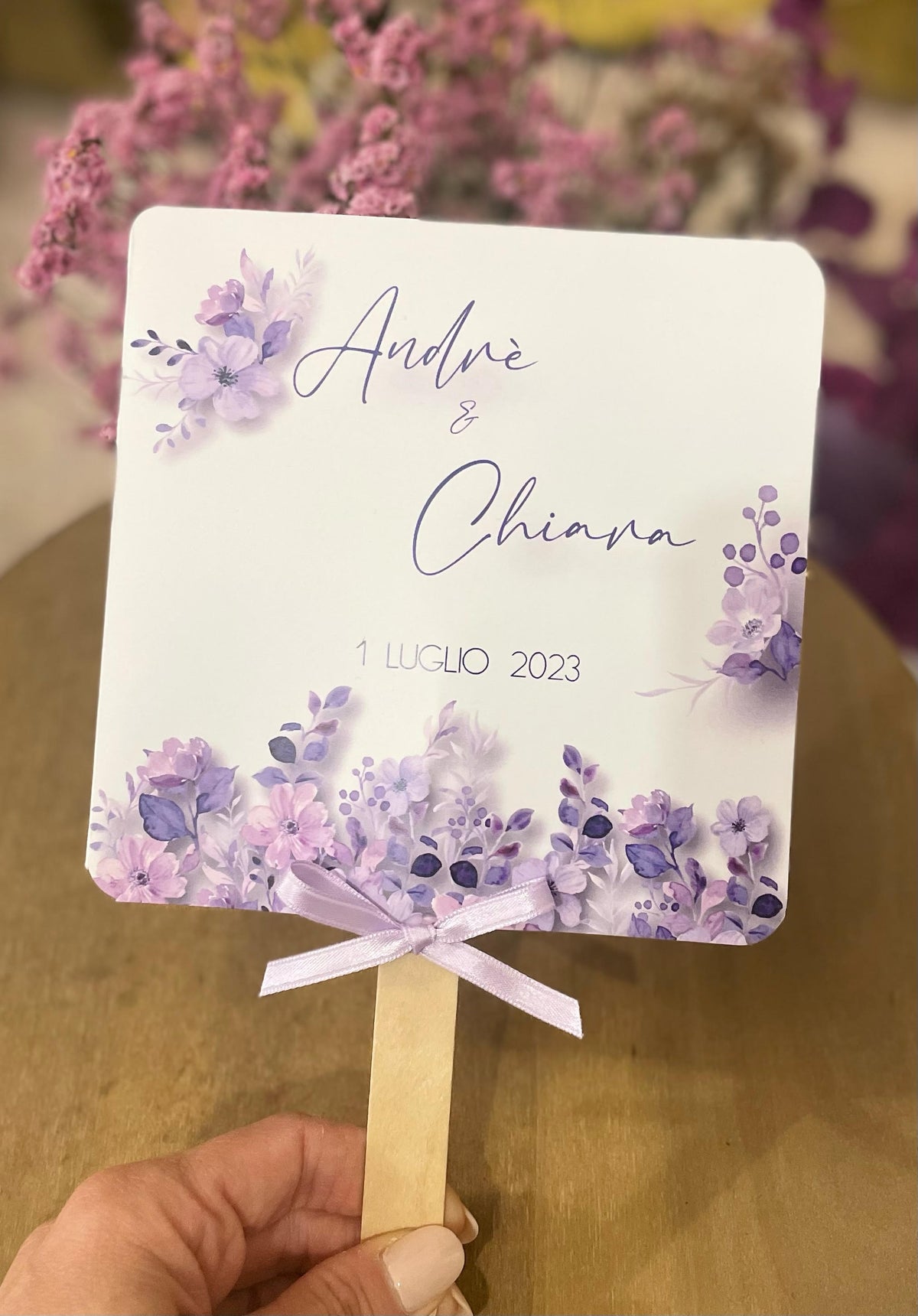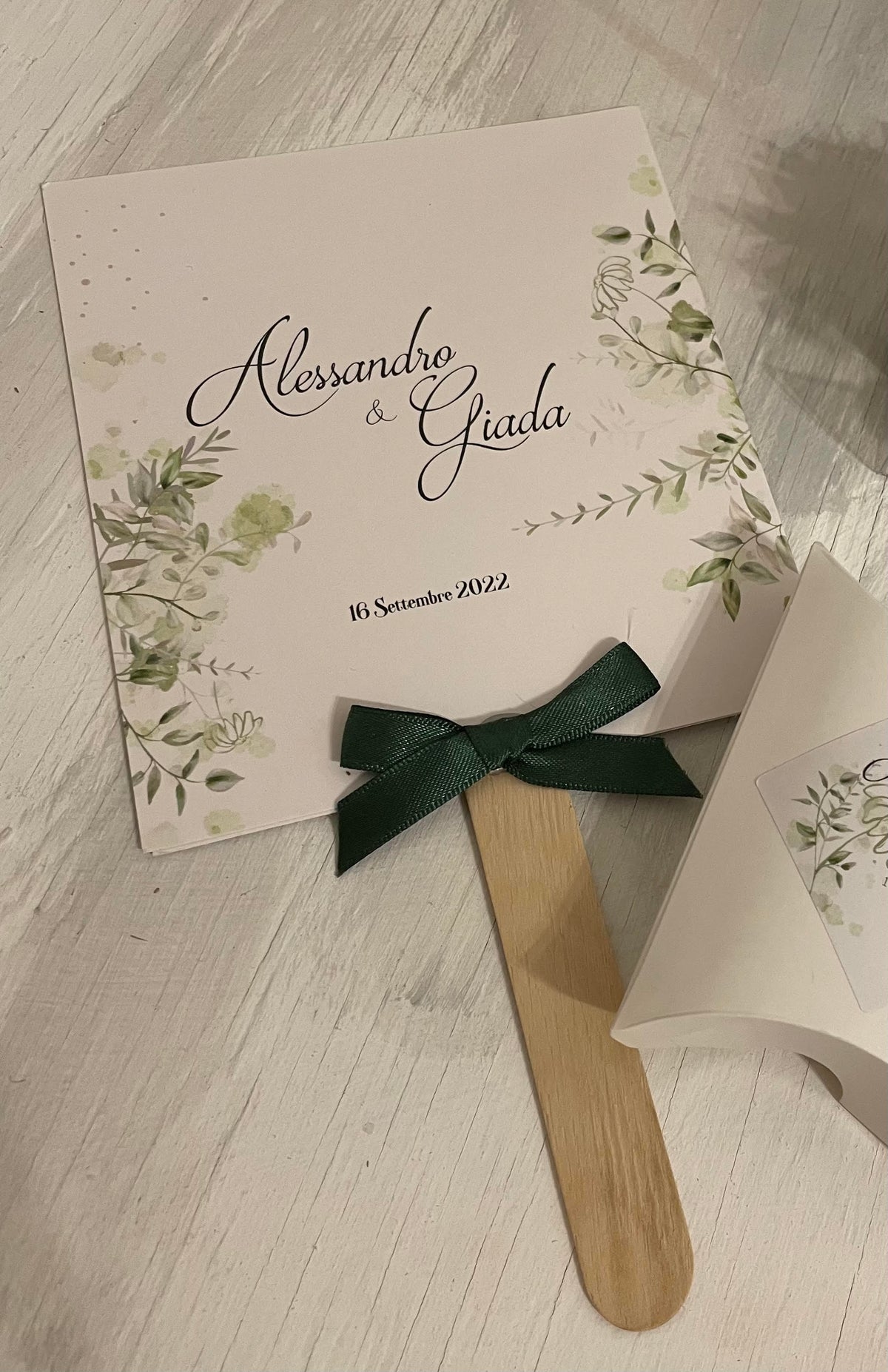 Ventaglio per matrimonio realizzato in legno e cartoncino di alta qualità da 300 gr bianca. Possibilità di scelta grafica e colore nastro tra le foto. Stampa su due lati.